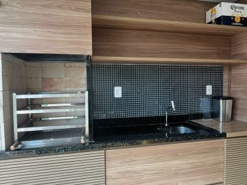 Varanda gourmet com churrasqueira a carvão;