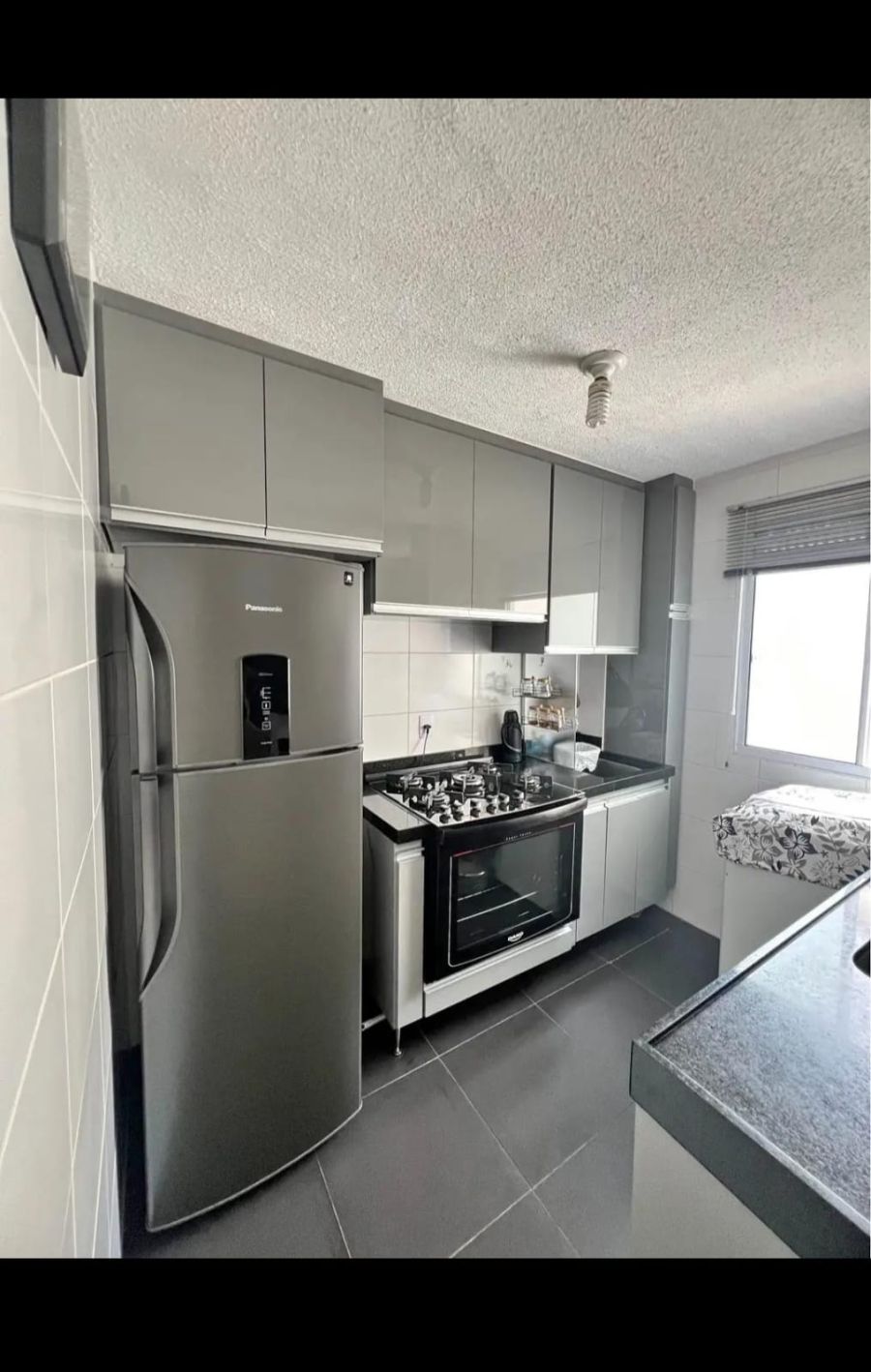 (Fogão, geladeira, mesa, persiana, rack e sofá)